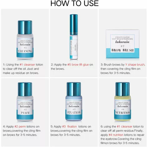 Contenu de l’emballage : 1 film alimentaire, 1 brosse pour sourcils, 1 nettoyant, 1 lotion permanente, 1 lotion de fixation, 1 lotion nutritive, 1 colle pour sourcils. appliquez la colle #5 brow lift sur les sourcils 3 : brossez les sourcils avec une brosse en forme de Y, puis couvrez-la avec le film alimentaire 4 : appliquez la lotion permanente #2, en recouvrant avec le film alimentaire environ 3 à 5 minutes 5 : appliquez la fixation #3 lotion, couvrant avec le film alimentaire environ 3-5 minutes 6 : utilisez le nettoyant #1 pour nettoyer tous les résidus de permanente 7 : enfin, utilisez la nutrition #4 pour réparer le sourcil, en le recouvrant d’un film alimentaire environ 3-5 minutes